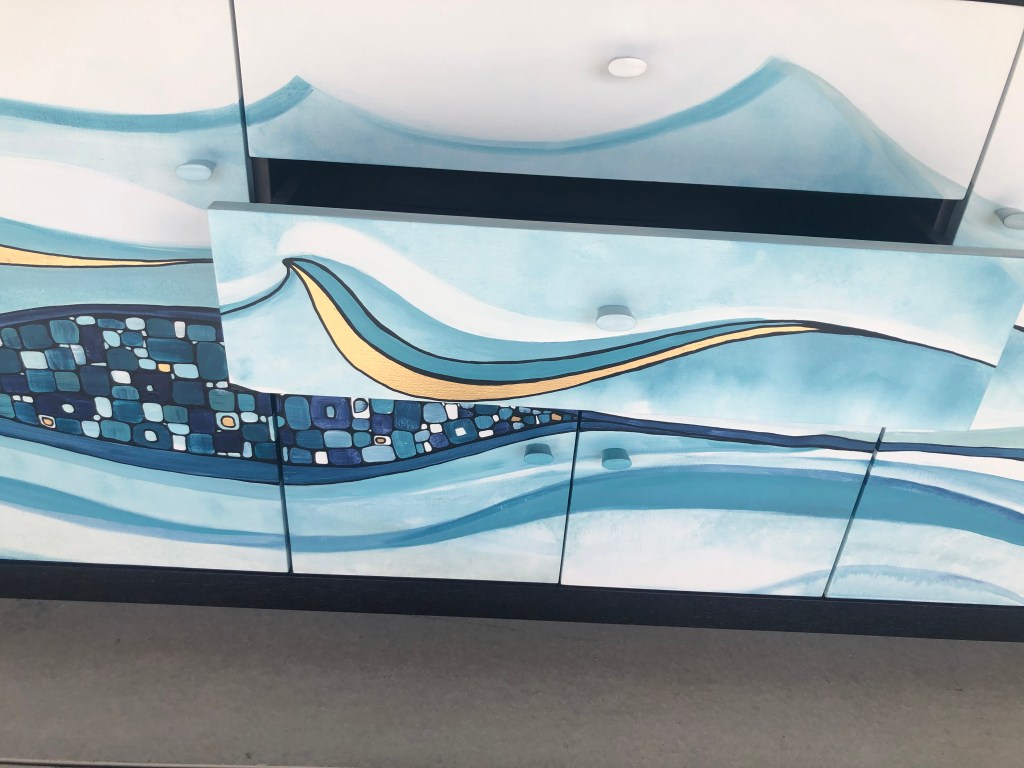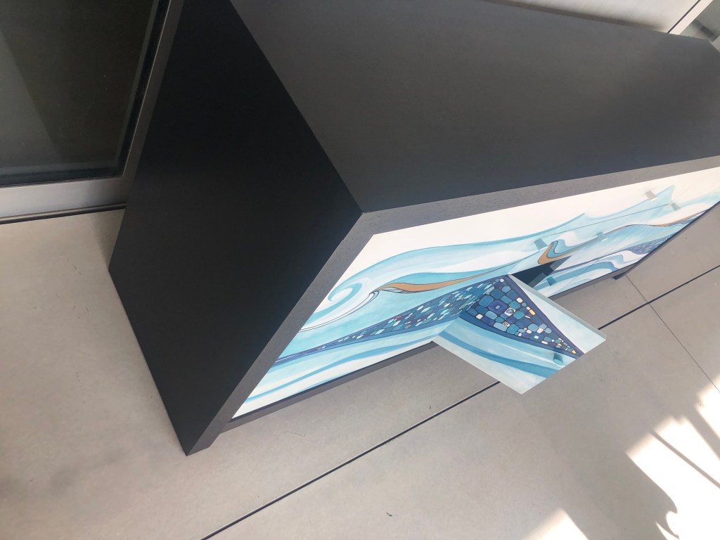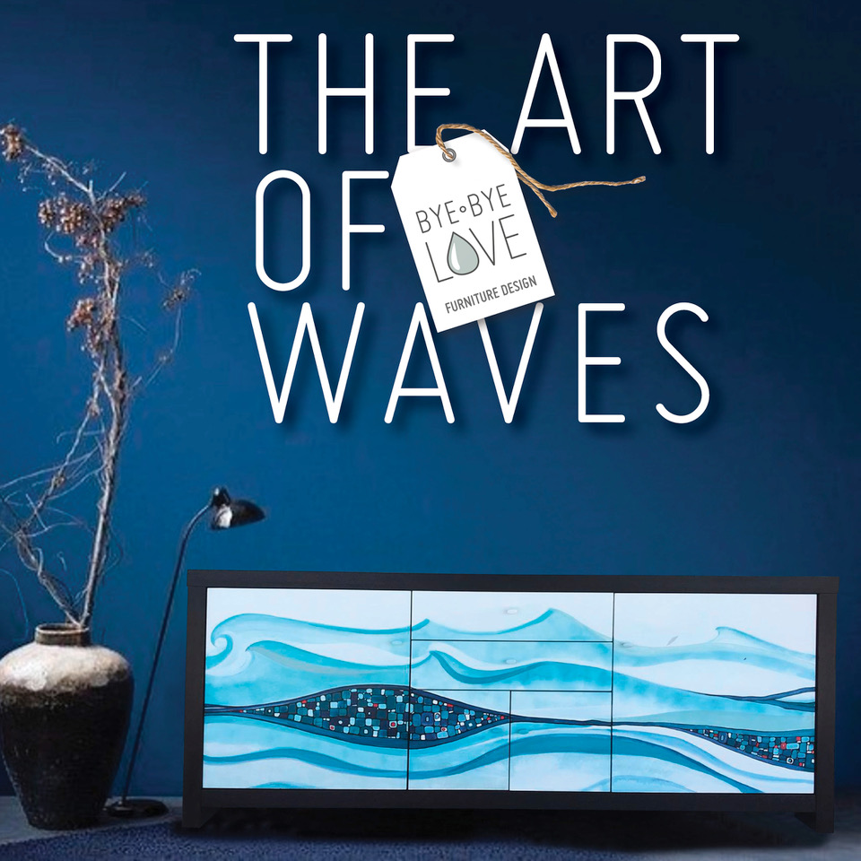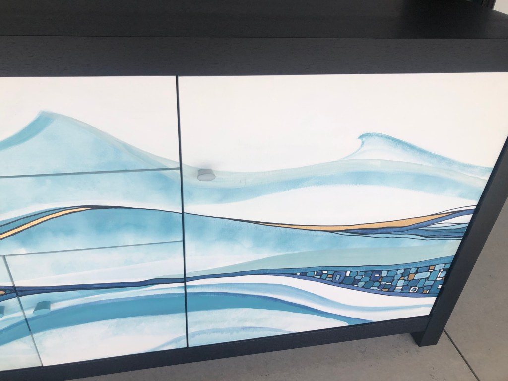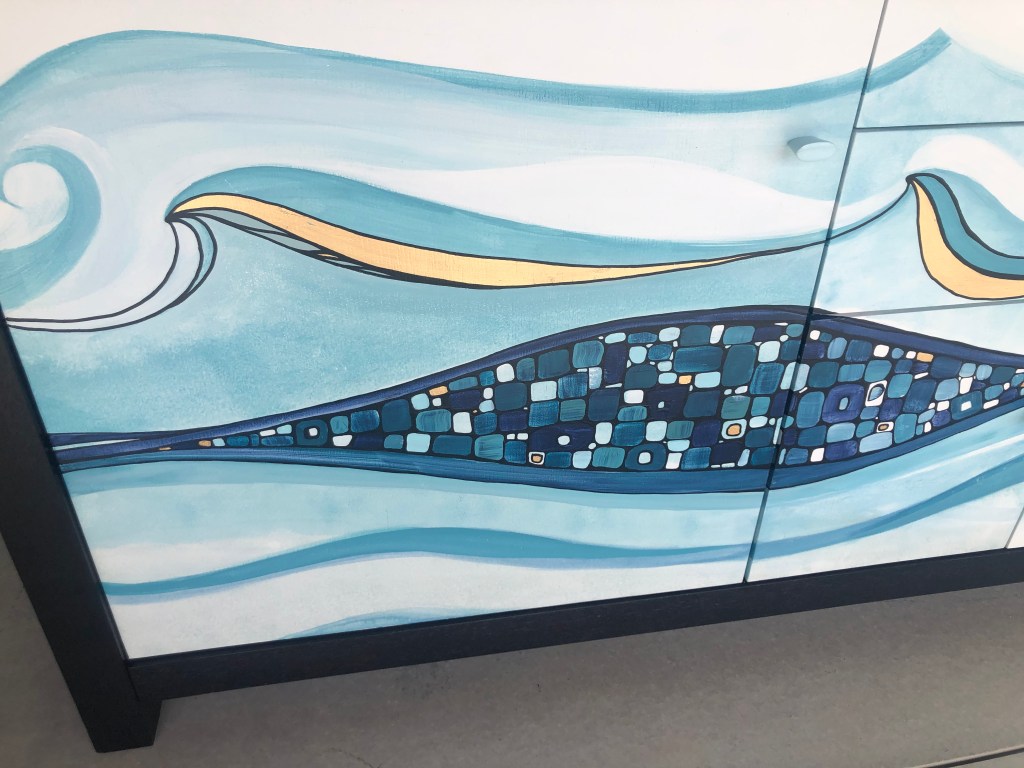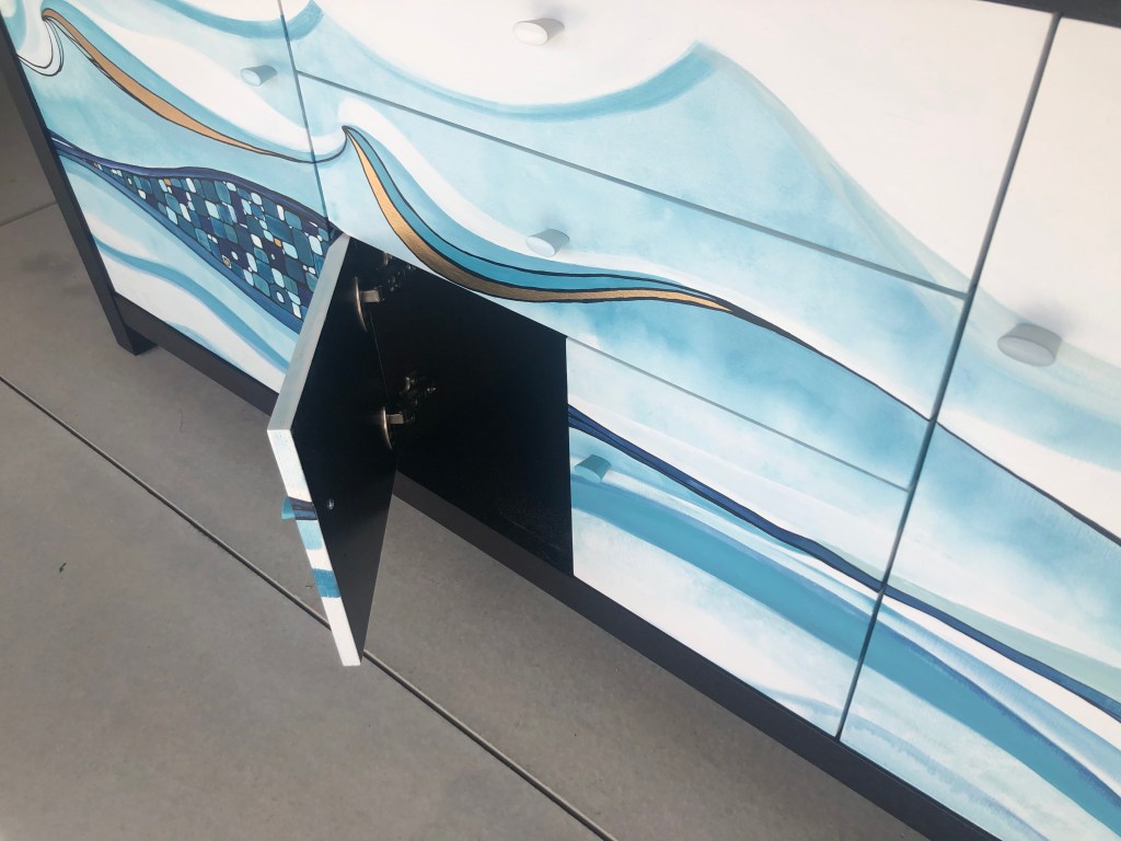 This beautiful solid sideboard is restored to a high standart. The body is painted in Resene Black, the waves and the pebbles are hand illustrated in different shades of Resene Blue and Gold leaf.