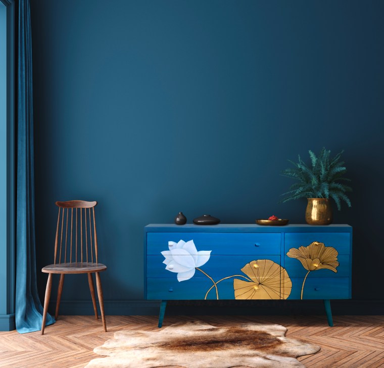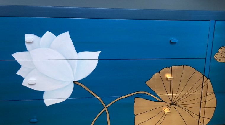 This is another beautiful commission piece. We finished this beautifil solid wooden sideboard in blues, gold leaf and white. We love, love, love how these blues turned out, especially in combination with gold leaf.