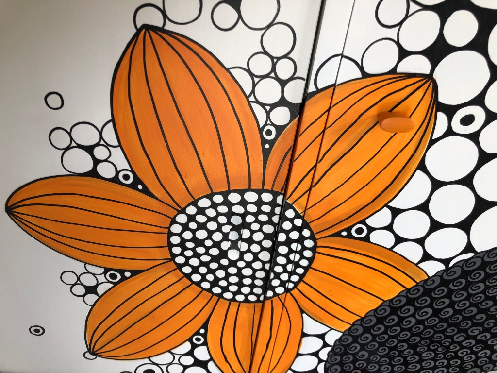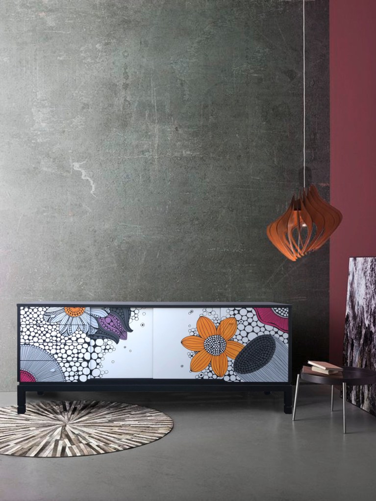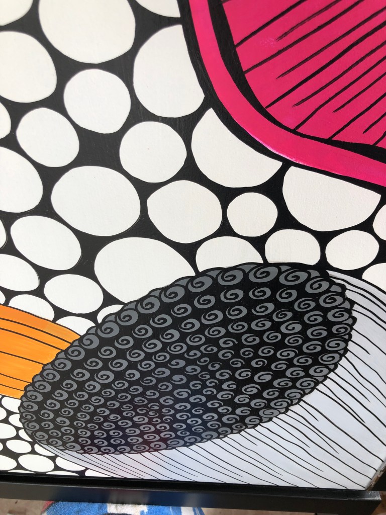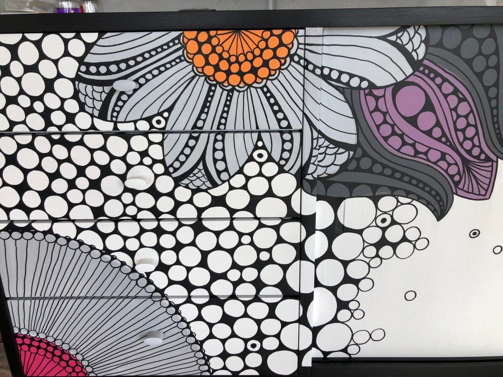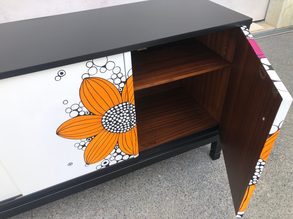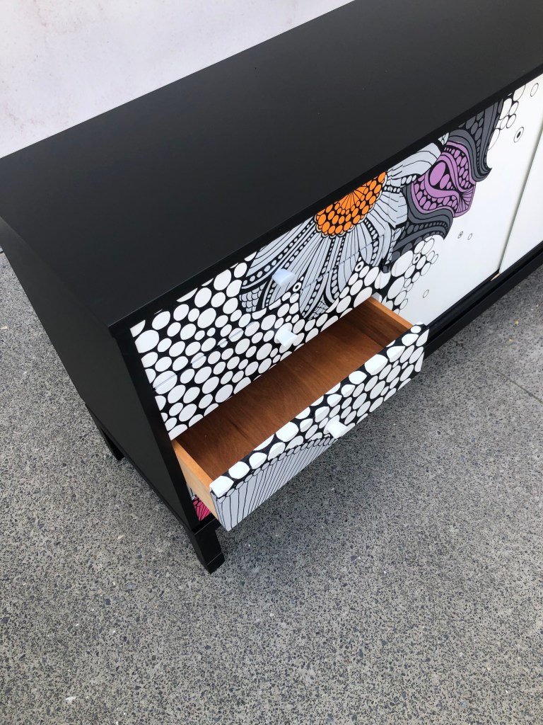 Debra´s beautiful Danske Mobler sideboard was another commission piece. These Danske Mobler pieces are very solid and perfect for redesigning. We finished this masterpiece in black for the body the fronts are painted in white with free hand illustrated design in greys, orange, pink and purple.