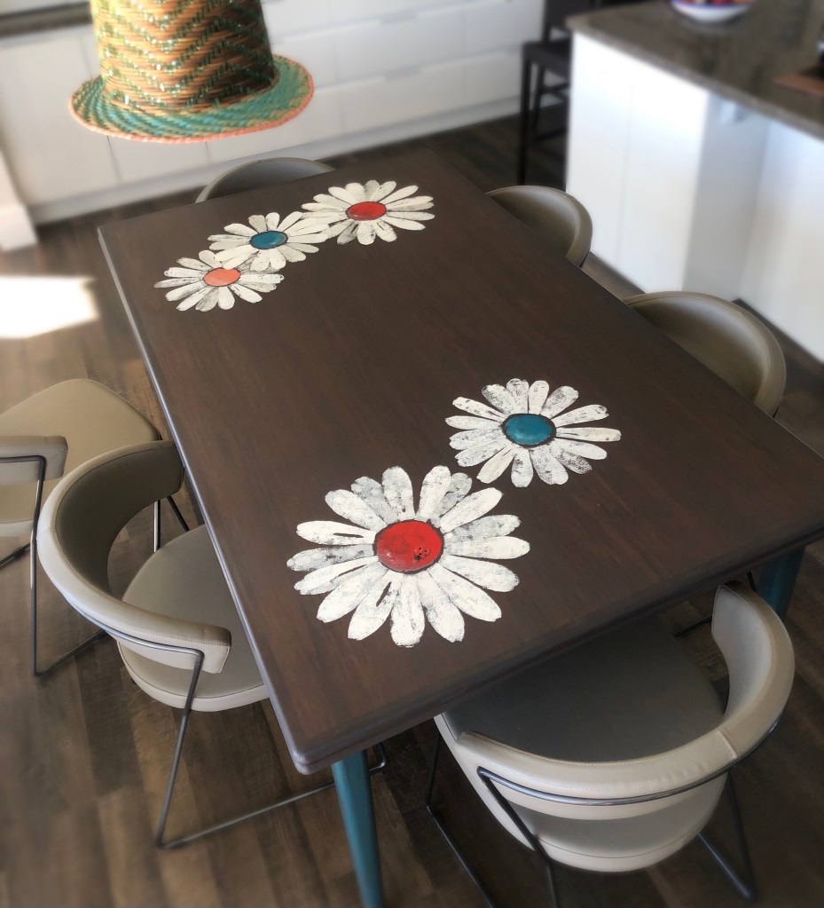 The table of Elaine Had a big stain The colour all wrong But otherwise strong We gave it some love and listen enough To make her dream true, she wanted red and some blue To make it a feature,we gave her some creatures Which can now be found when friends and family are around.