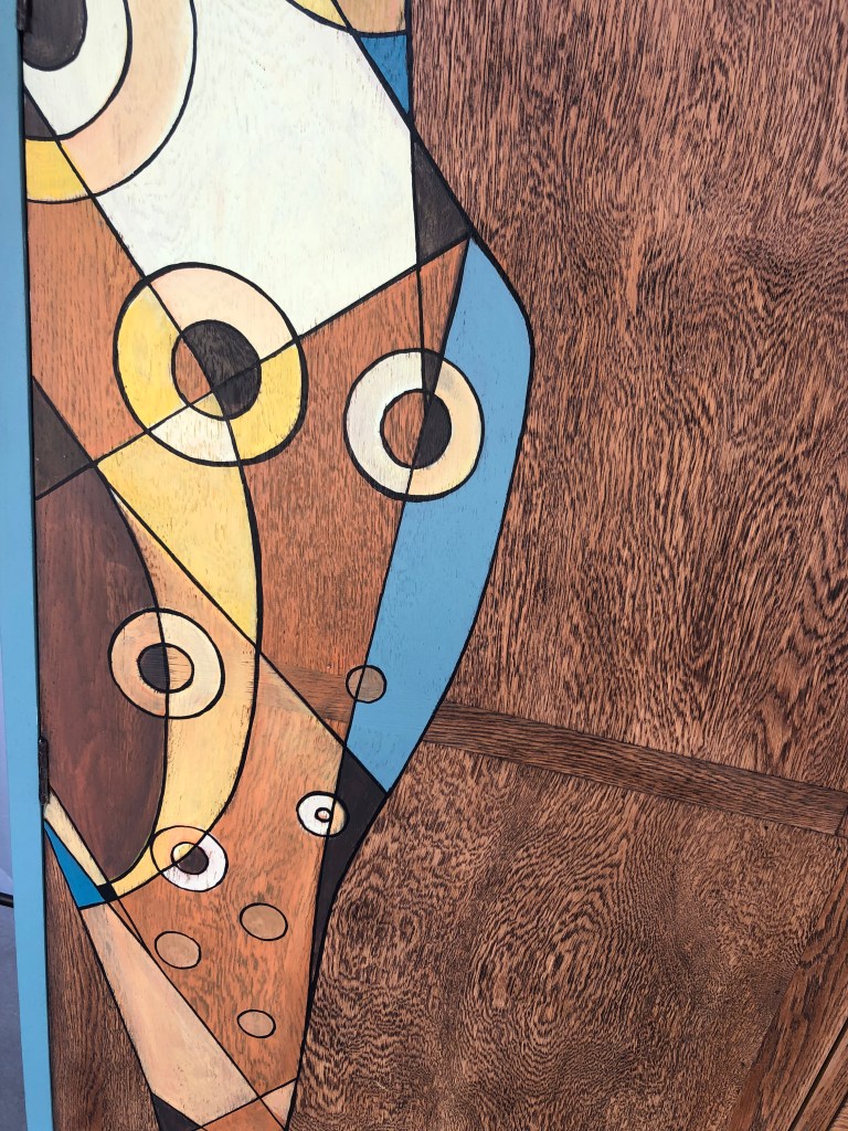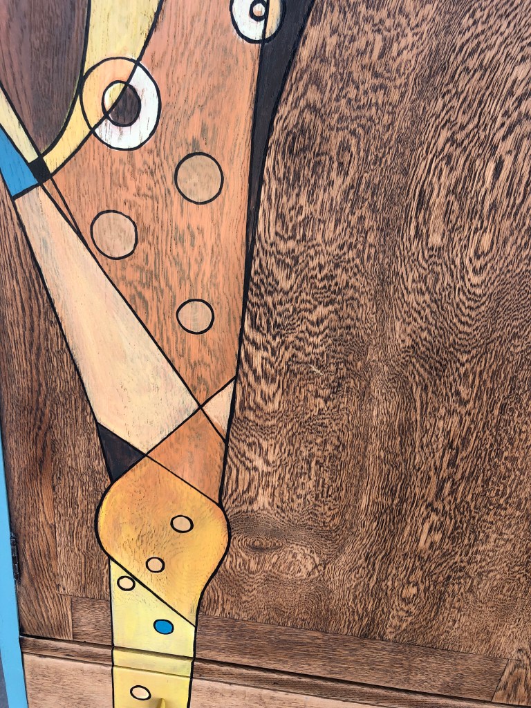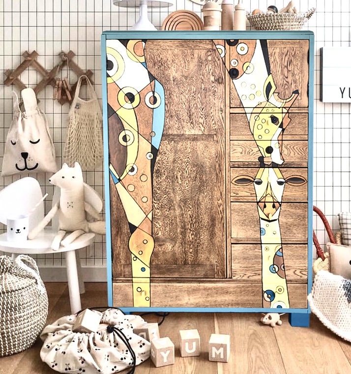 This is another customized piece. Our lovely customer made enquires if it was possible to turn his beautiful oak manrobe into a functional nursery piece. When questioned if they have any specific design requests they told us that the family adores Giraffes and they would like to see some blue and yellow![]()