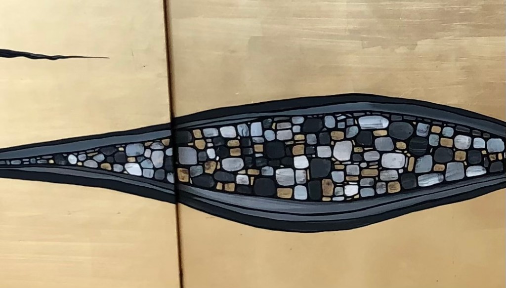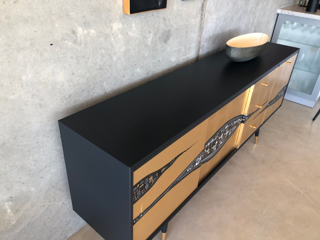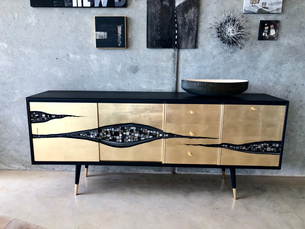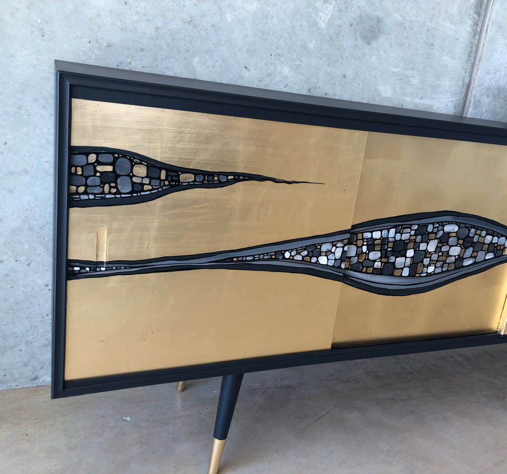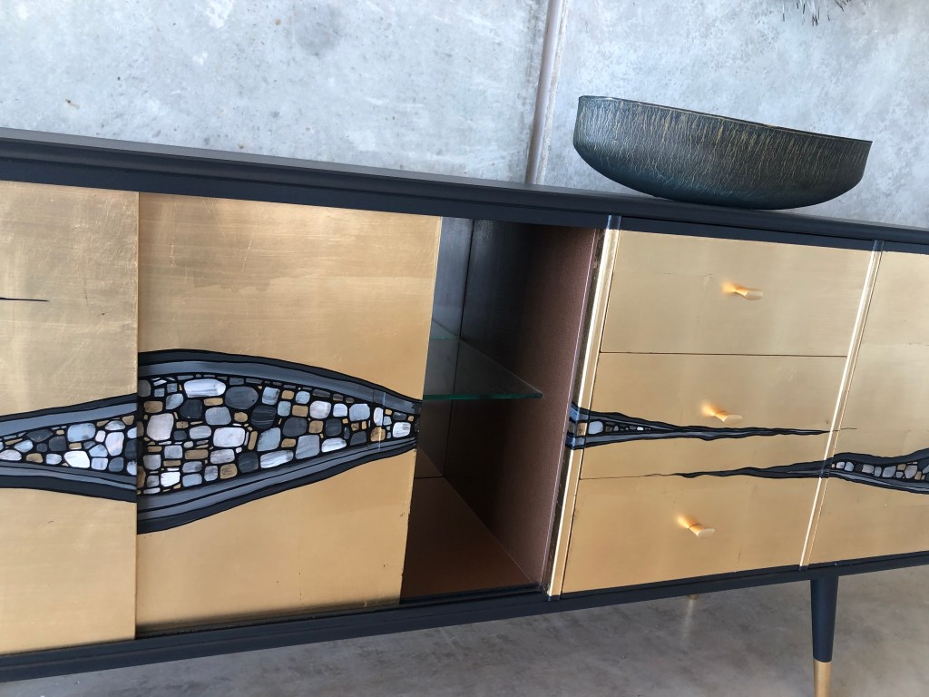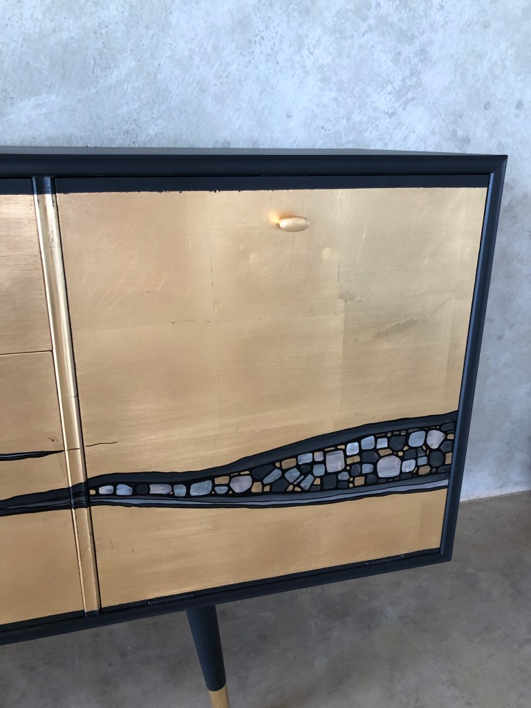Body is painted with Resene paint in black, front is covered with gold leaf, the river bed is free hand illustrated in different shades of black, greys and gold leaf. A beautiful upcycled piece in excellent condition.