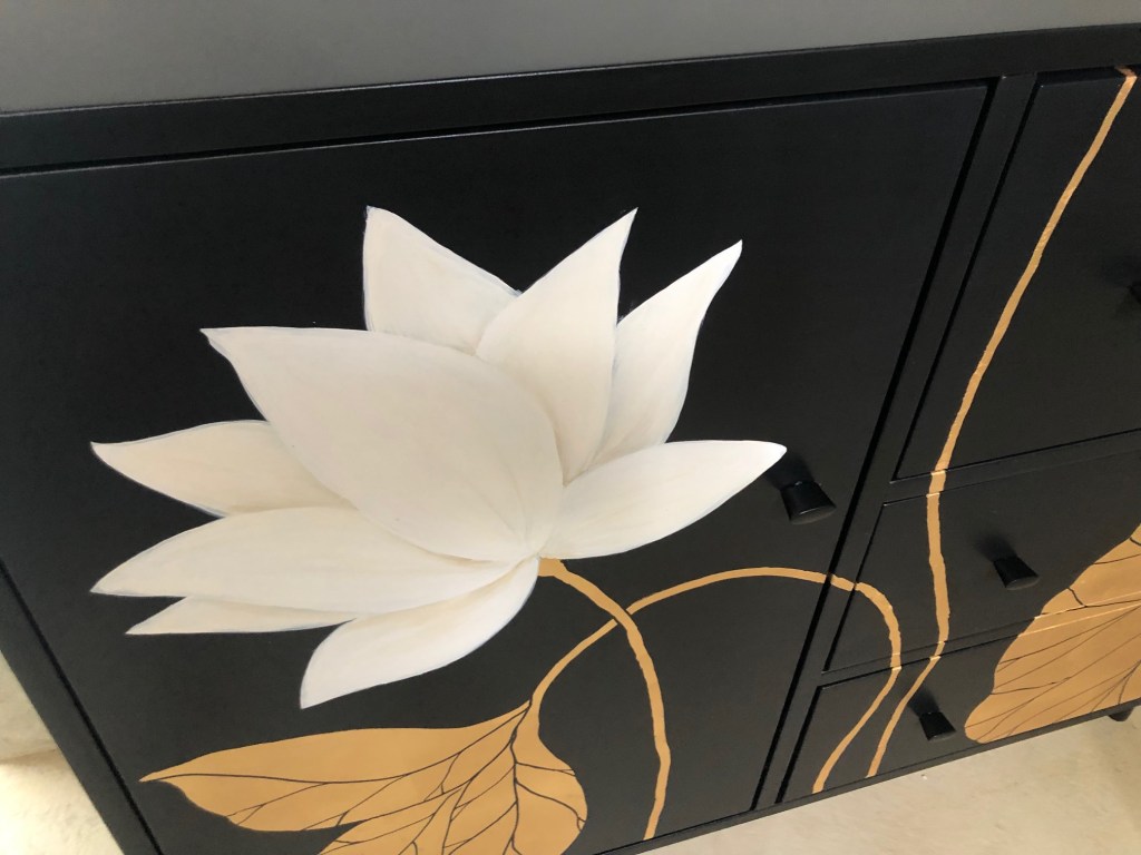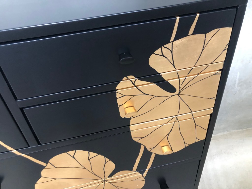 This beautiful sidebord in black with leaves in gold leaf, and an artificial painted lillie in white / off white is upcycled and in excellent condition. The drawers are on metal runners it has 5 drawers in different sizes and 1 door.