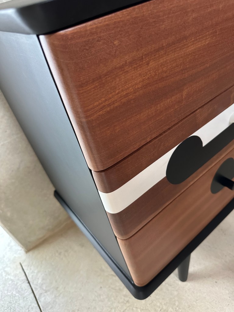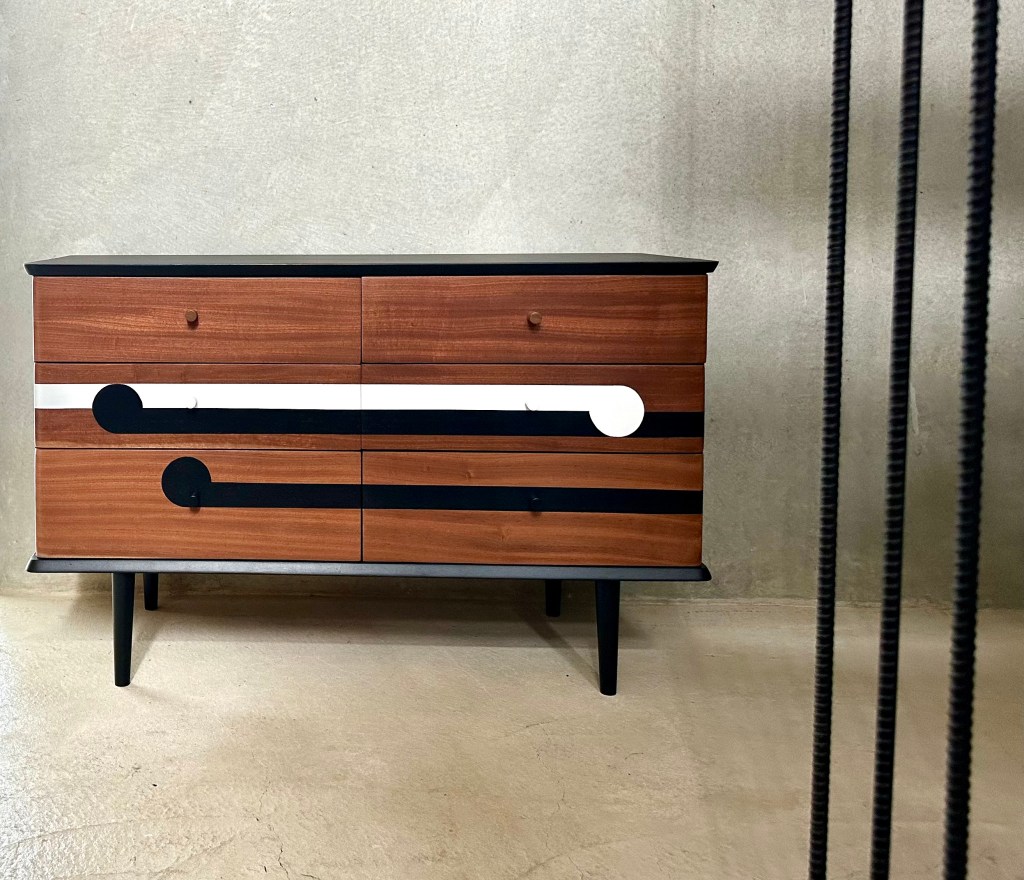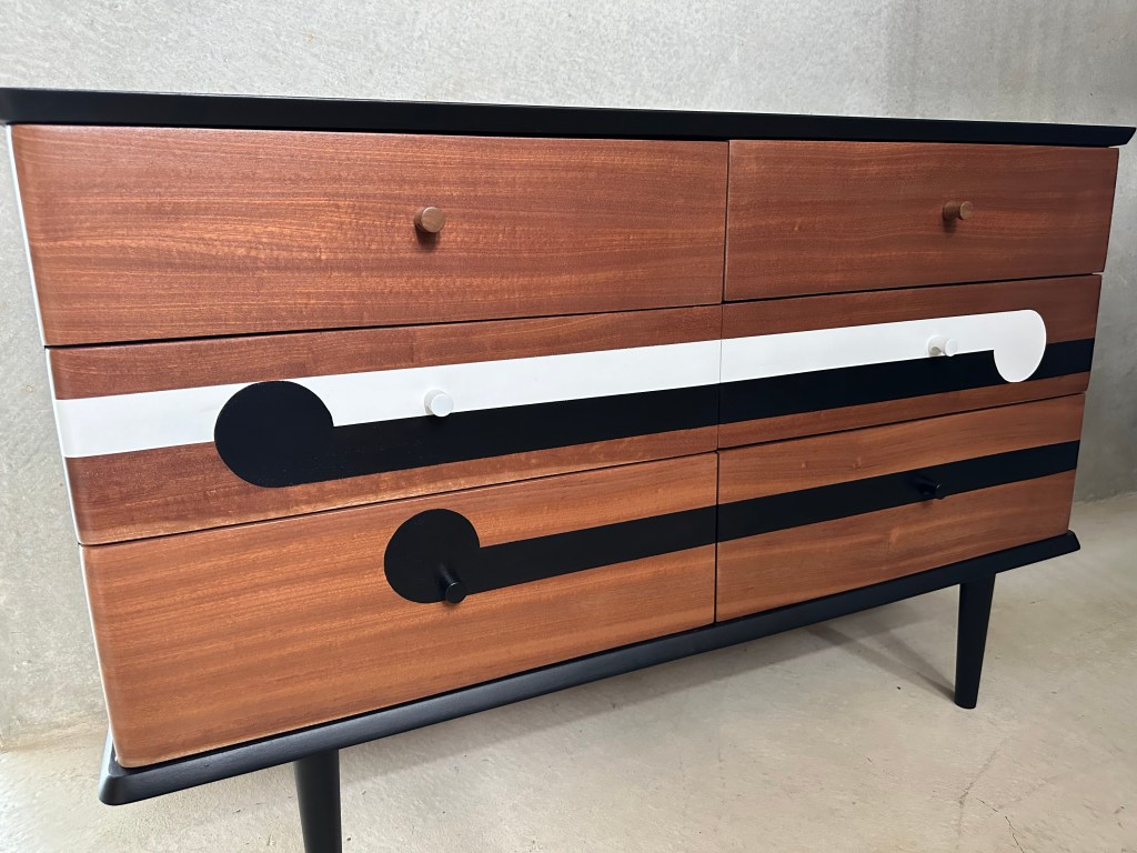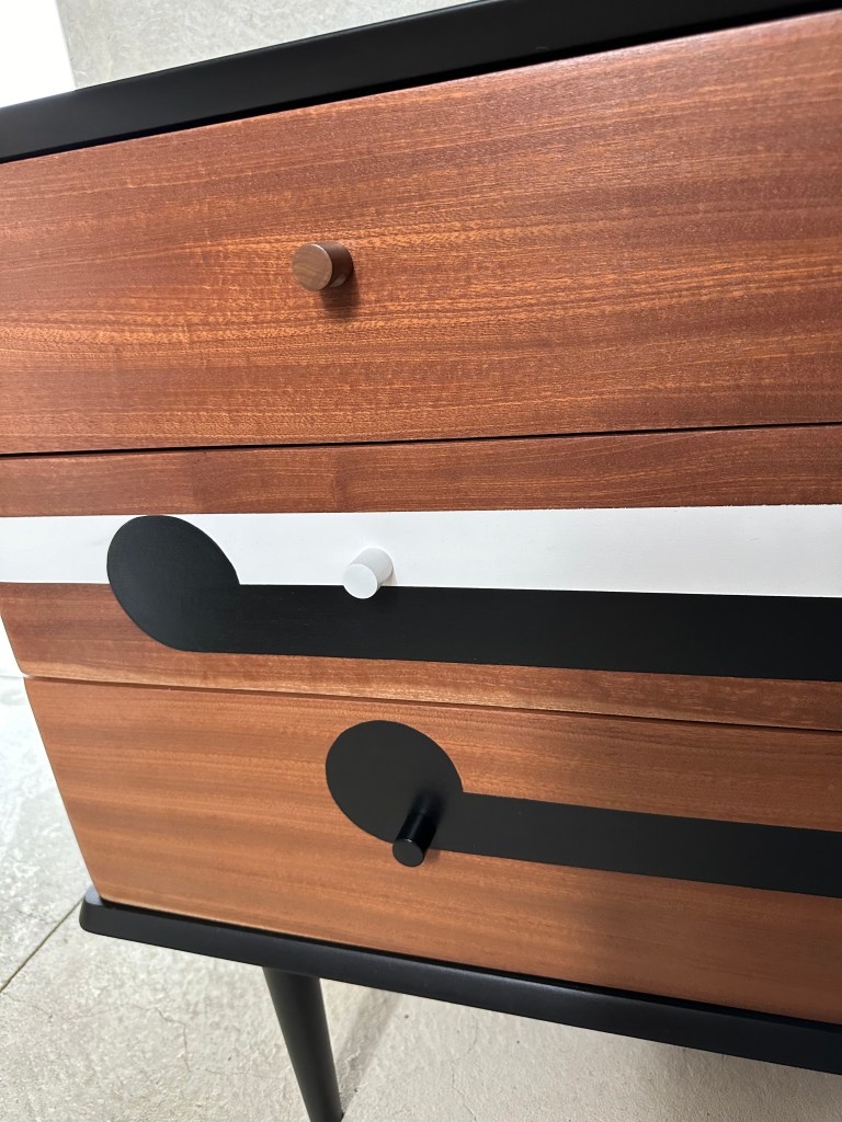 This beautiful solid wooden Teak Drawer is restored in detail. The front got sanded back to bare wood. The body is painted in Resene Black. The Gordon Walters Design is hand painted.