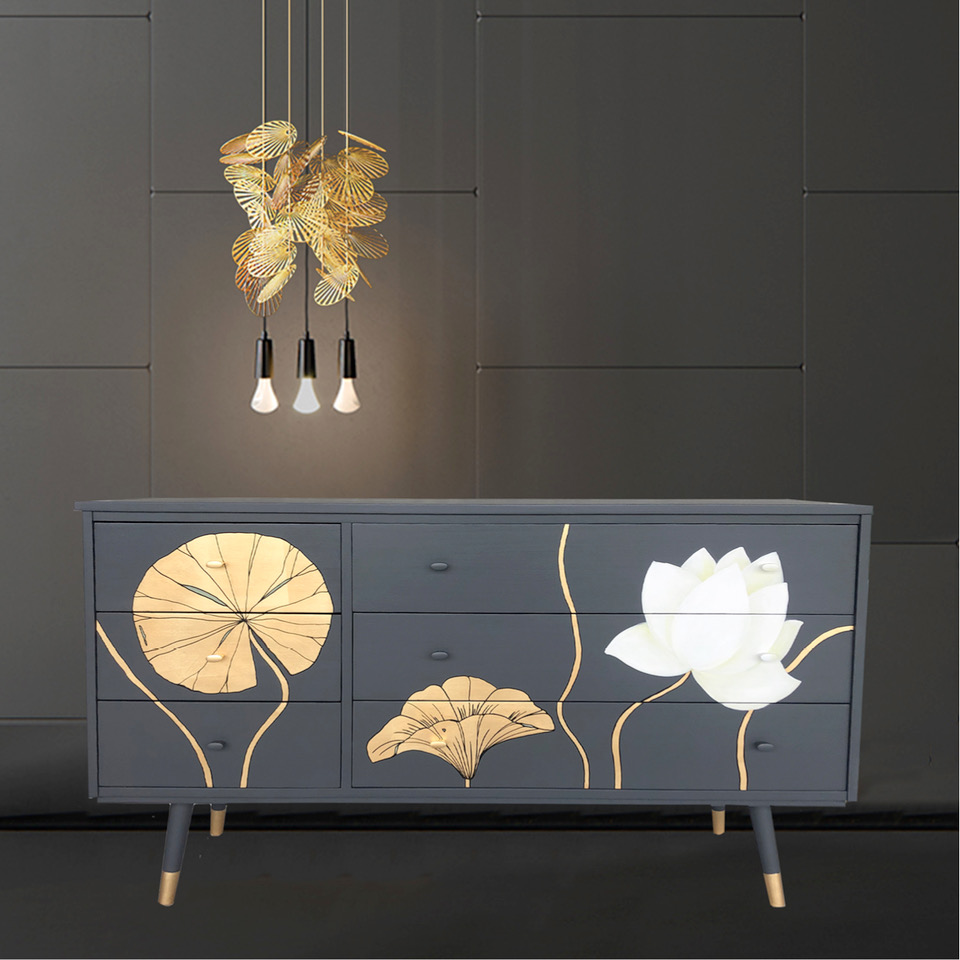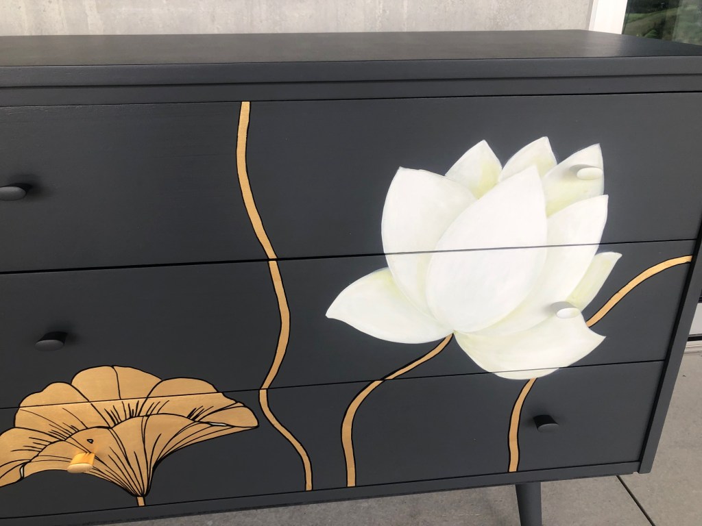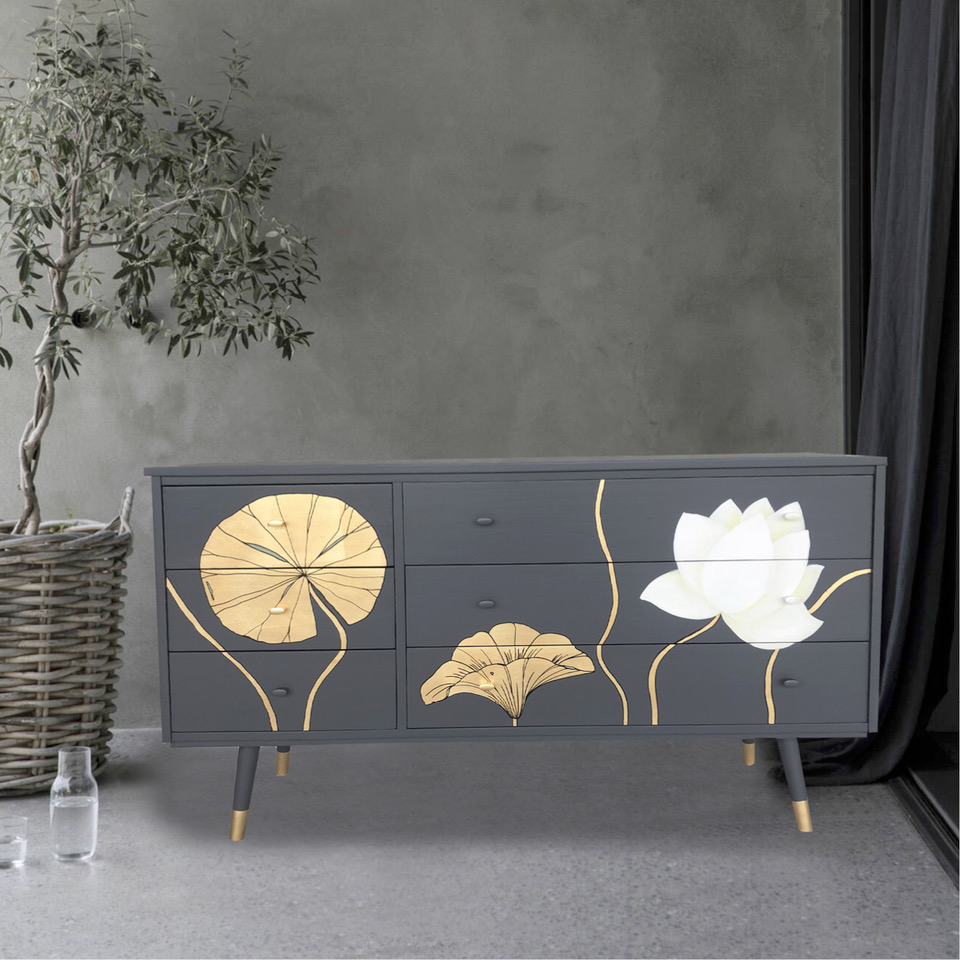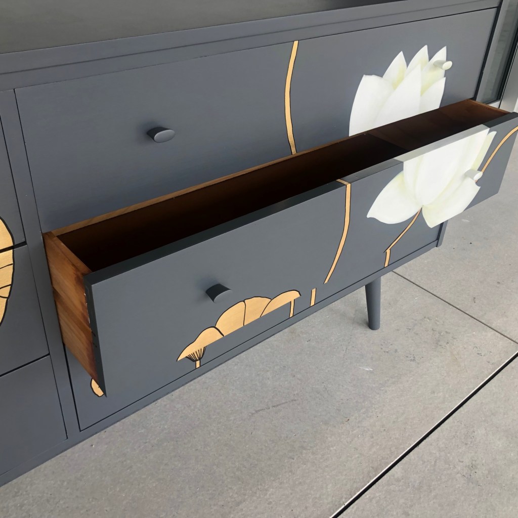 ‘Lilian’ is a beautiful solid wooden sideboard painted in Resene grey, leaves are designed with gold leaf. The sideboard is in excellent condition and is waiting for a new home.