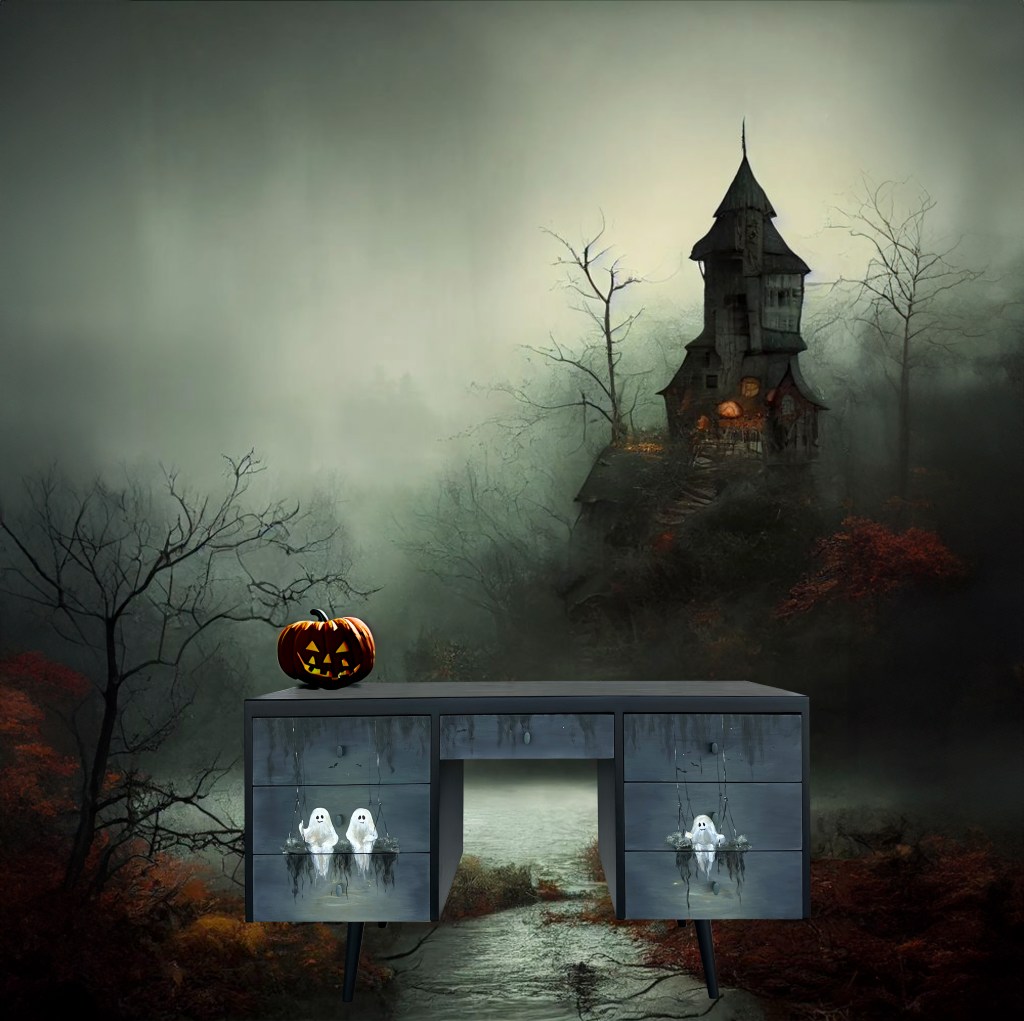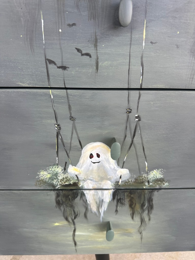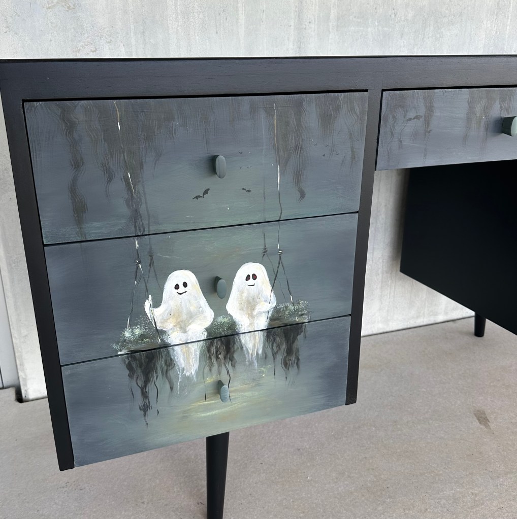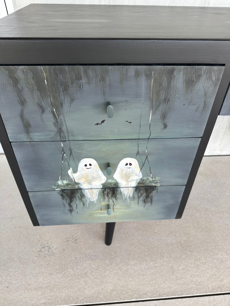 We finished this gorgeous piece for all our Ghost lovers. This dresser is made of solid wood, restored and in excellent condition. The body is painted in black. Design is free hand illustrated.