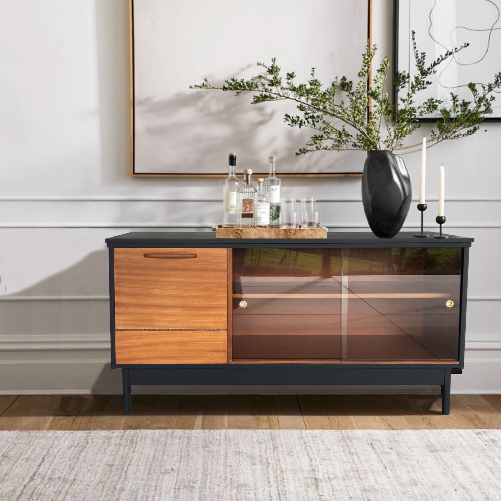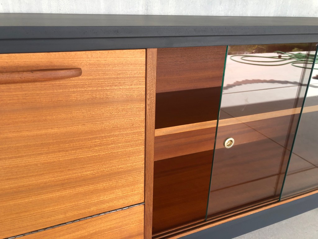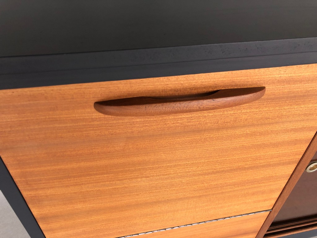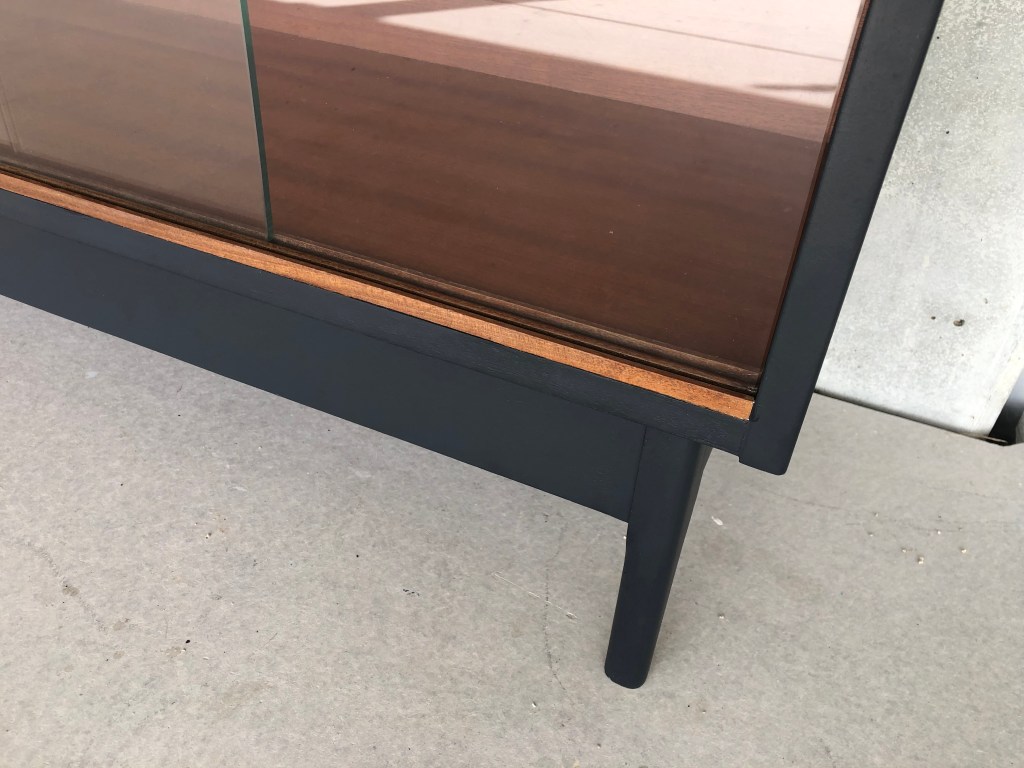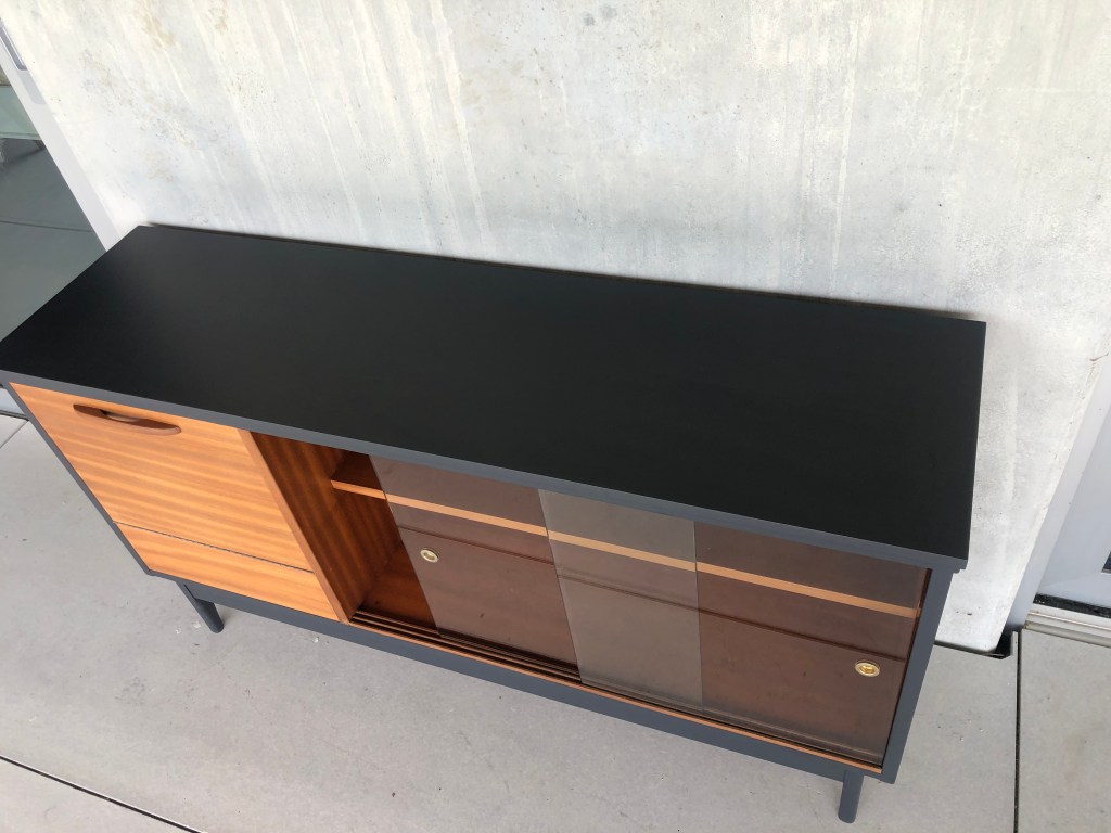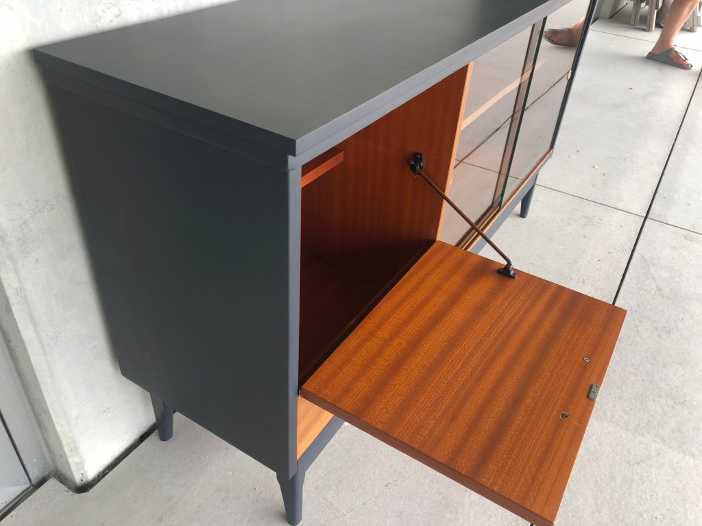 Fresh from the workshop is this beautiful midcentury drinks cabinet. We restored this beauty in detail, its in very good condition. The body is painted in charcoal, the glass sliding doors are in excellent condition too,