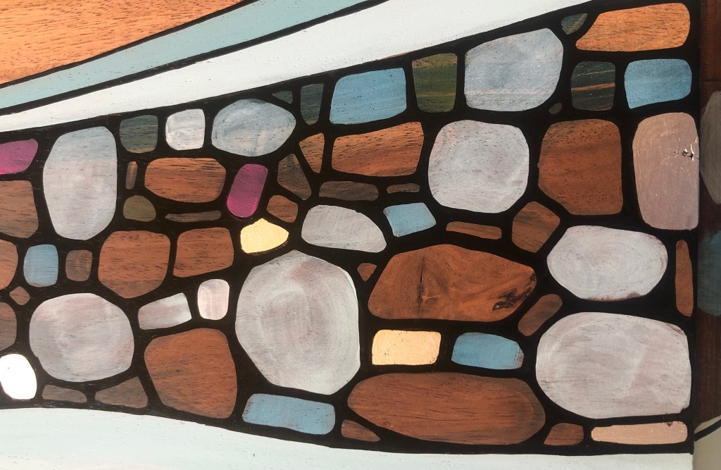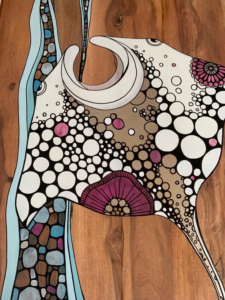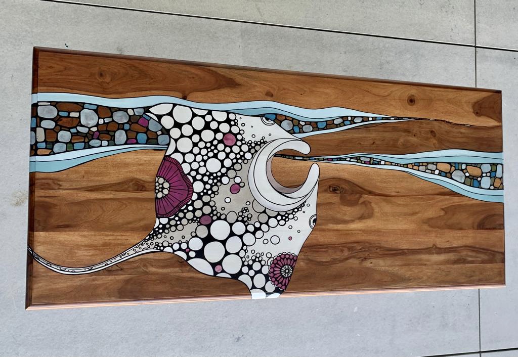 This beautiful table was a commission for a lovely family. It was about to be a piece to remember their time in New Zealand. The kids were asked whether they want a Stingray or a Whale design, and they even could choose the colour palette.