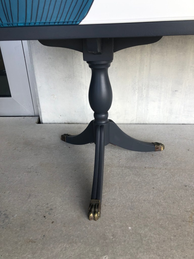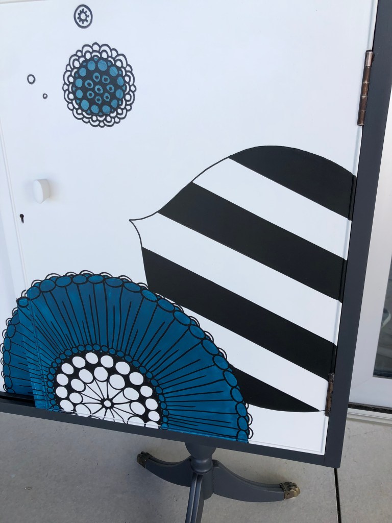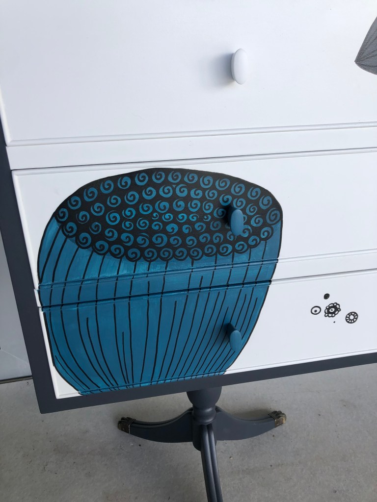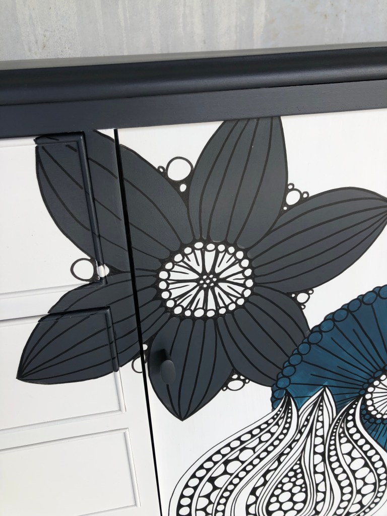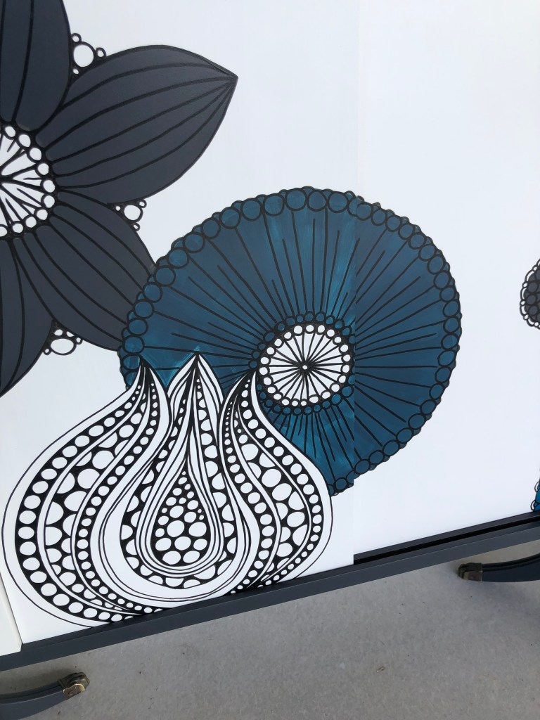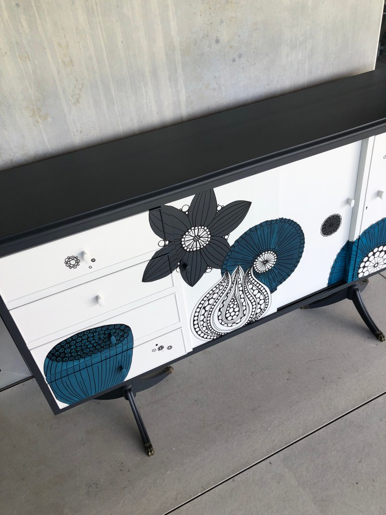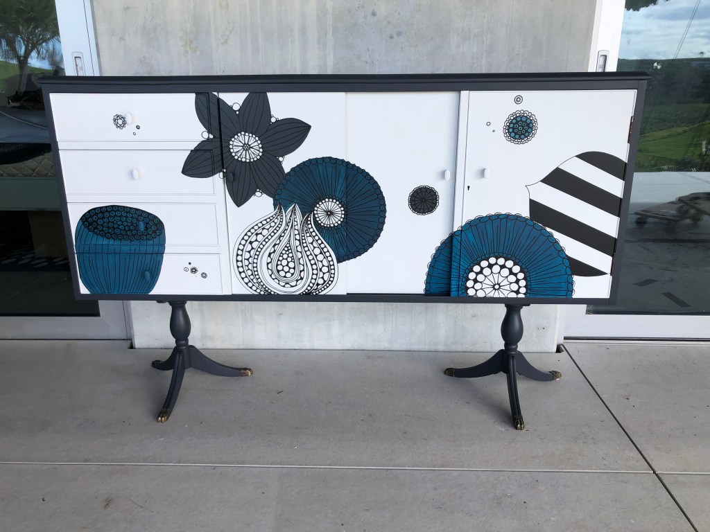 This was a commission piece for a lovely Lady in Hawkes Bay. She even brought her Mahogany piece in person to us. We had a long chat about colours and design to fit her interior. The body is painted in Resene Foundry, the background of the front is Resene double seafog. The flowers are painted in different shades of Resene Tangaroa, St. Kilda and Foundry.