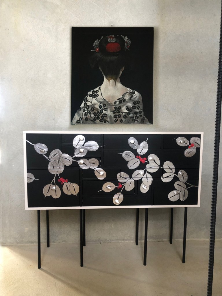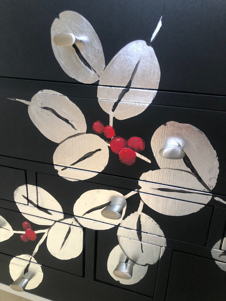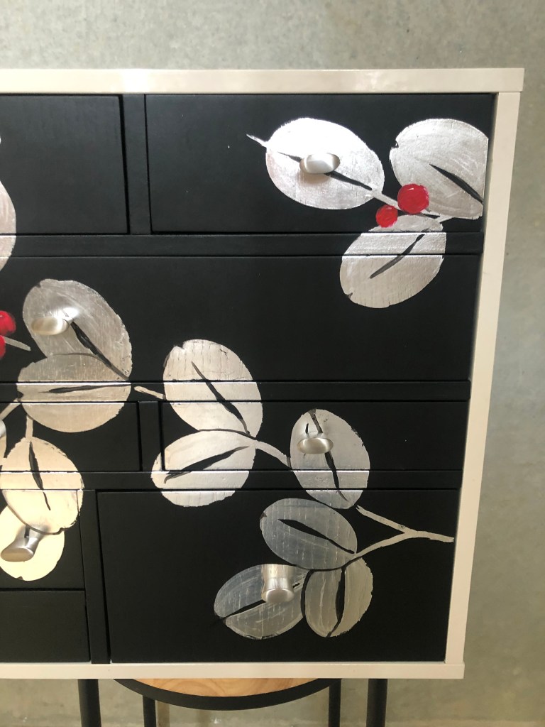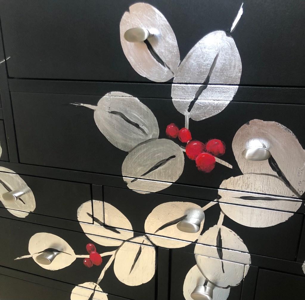 To match the picture was the request, so we painted all the drawers matt black and added leaves in silver leaf and little red berries. We also decided to give the piece new silver handles.