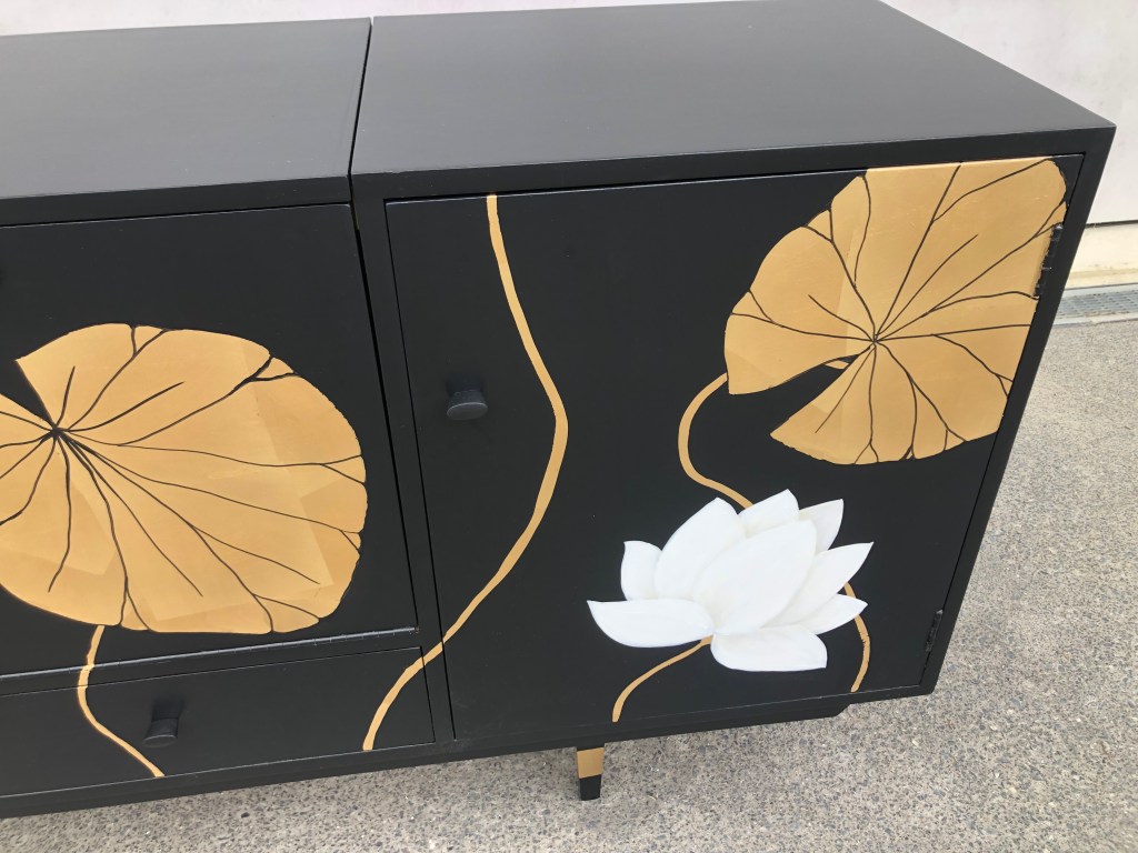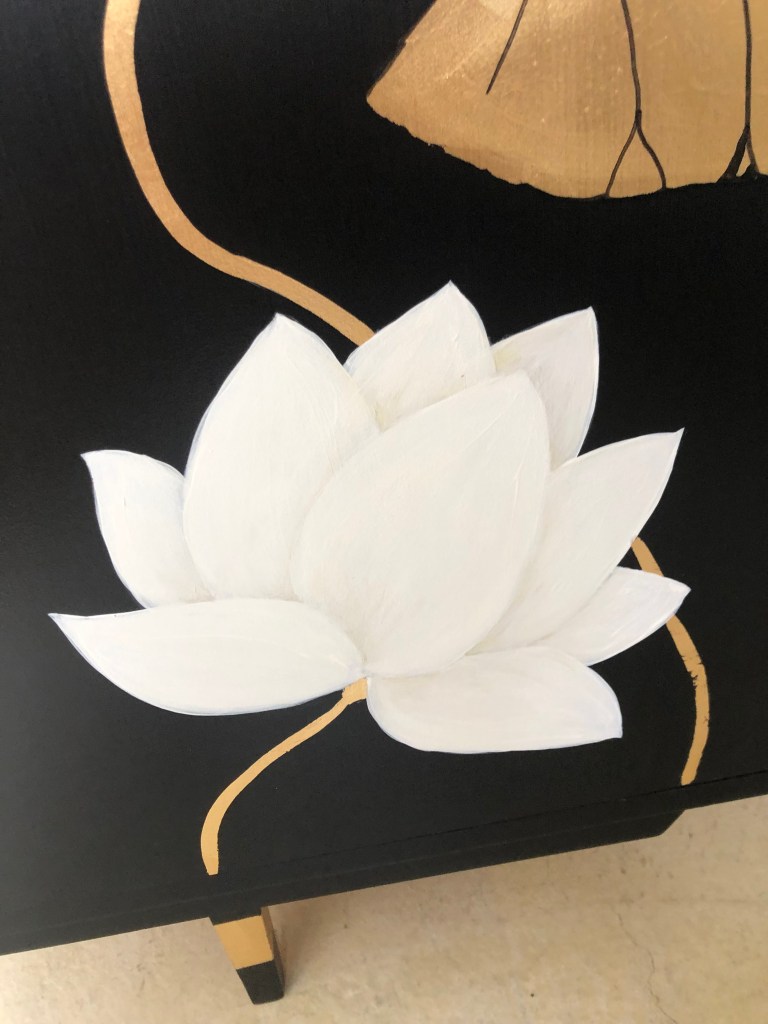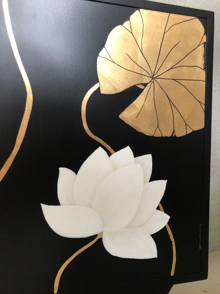This piece is painted in Resene black, fronts have gold leaf leaves and free hand illustrated Lillies. The body of the existing piece was in a good condition.